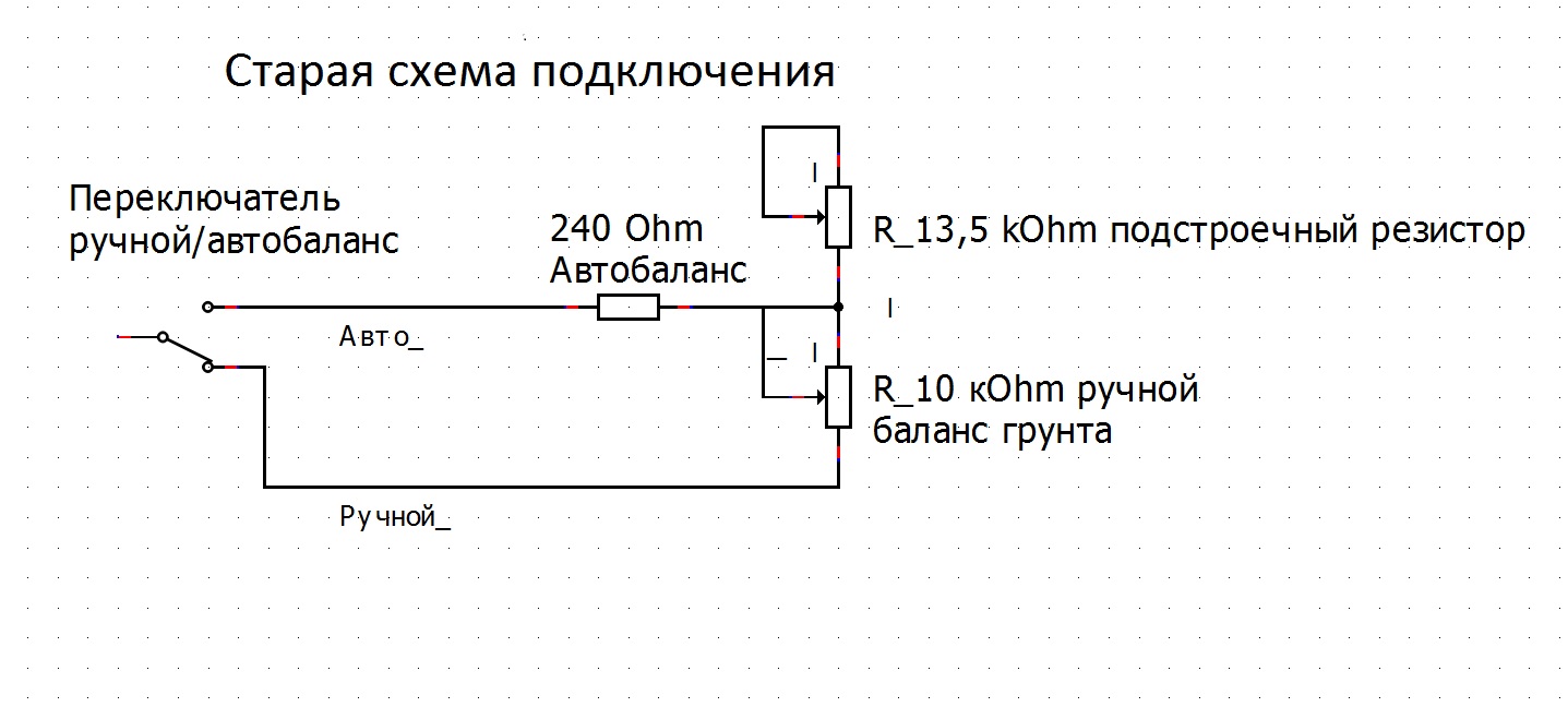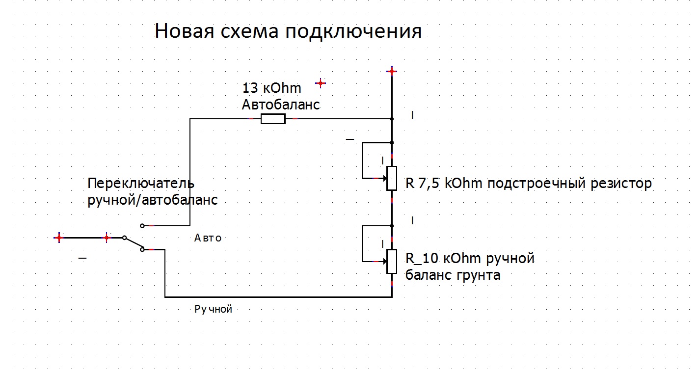 Выставляю схему переделанного баланса грунта на 4 про.На новой схеме подстроечный резистор 20 кОм на плате был занижен на 5 кОм,с заводских 13,5кОм на 7,5кОм,что дало возможность при ручной отстройке от грунта дальше уходить в минус.А автобаланс был подключен в обход подстроечного резистора сопротивлением на 13кОм,чтобы сохранить заводское сопротивление.