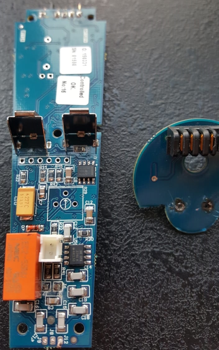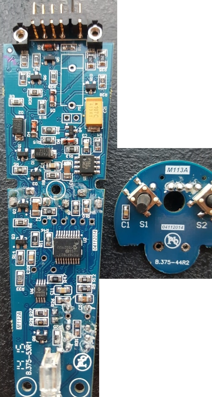 Прибор был куплен моим знакомым года 2 назад с рук, его уже ковыряли, он при включении так же писал " перегрузка батареи", но потом переходил в рабочий режим и работал. А начал выключатся после того как переломились провода в месте входа в катушку, а его тесть пытался сделать катушку и заполнял уксусным герметиком внутри ( это-же кислота) в месте ввода кабеля. В общем после этого стал включаться писать "перегрузка батареи" и выключаться, с рабочей катушкой и вообще без катушки. К стати там стоят полевики IRF7105 на малой плате 2 шт и на большой 1шт. - установленные при первом ремонте