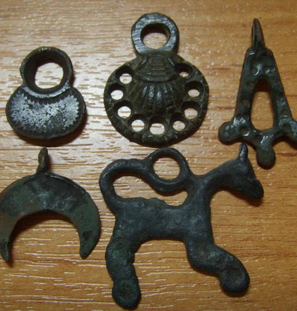 Вот мои - кобанские. Левый ясно что, особенно женщины угадывают безошибочно. Правый амулет, по форме кобанской булавы. Линейку забыл приложить, размер 2-2,5 см. |