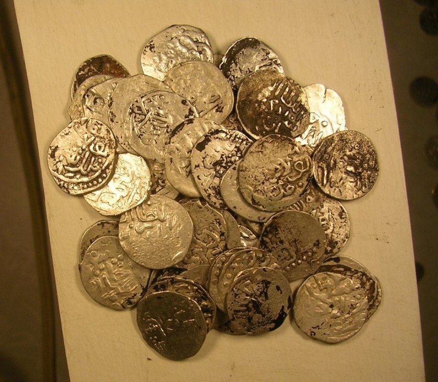 Первая монета, она же самая дорогая - денга петра 1 в сохране. Нашел в песке