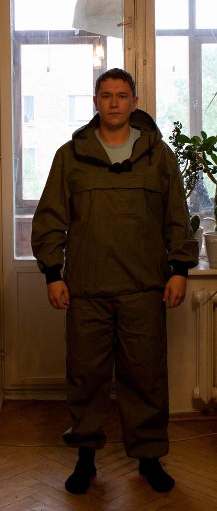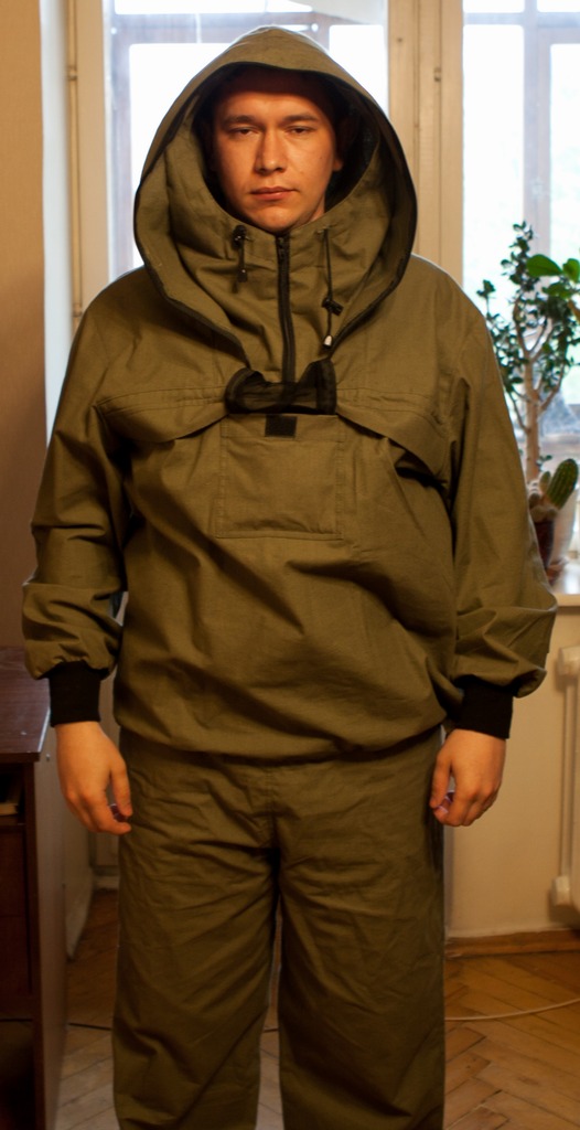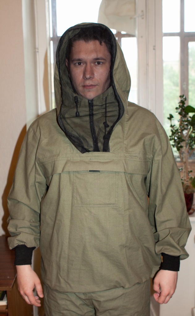 У меня такой замечательный костюмчик. Материал палаточный, с защитной москитной сеткой. Прекрасно защищает от назойливых комаров, слепней в лесу. От клещей есть пропитка, но я рекомендую пользоваться доп средствами. Надпись на спине поможет избавиться от лишних вопросов со стороны местного населения
