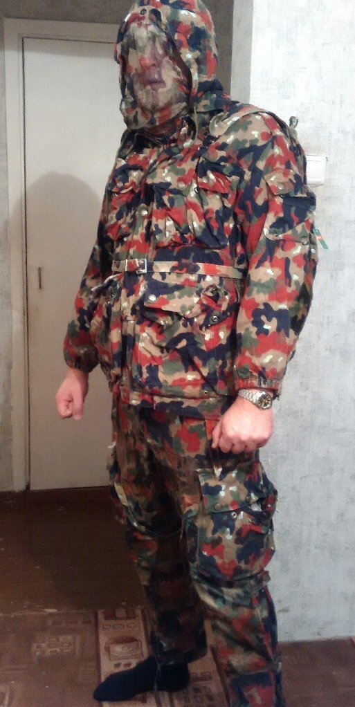 Купил себе камуфляж на следующий сезон!!! Униформа Швейцарии, комплект куртка-брюки-рюкзак, доволен нету слов, все нравится - куча карманов, спереди-взади, всяких штучек, ремешки -карабинчики, застежки, капюшон, москитная сетка, наколенники и налокотники прорезинены и самое главное расцветка радует глаз...