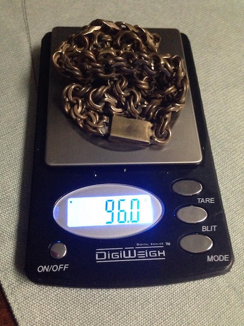 Спасибо, сам доволен как слон. Я паун шопы пока на этот предмет не опрашивал. А чего там действительно как в русском ломбарде? Типа не хотите - не продавайте. Я в РФ с барышень обычно угораю, которые этот шмурдяк притаривают под видом инвестиций в вечные ценности (за две цены металла) а потом в скупке расстраиваются когда им пол цены металла предлагают )))). В США вроде должно быть не так, но в любом случае во первых нужды срочно продать нет, так что паун шопы обломятся если меньше биржи предлагают, а во вторых путей продать и на крейг листе с ебеем полно, да и в РФ на овите тоже уйдет, причем дороже металла - цепь отличная, хорошего плетения, только почистить. Так что по текущей бирже это что-то около 1700 чисто за металл, а на крейг листе если толкать - 2000 минимум, ибо в магазине такая будет стоить от 2500. Если есть опыт по паун шопам - просветите