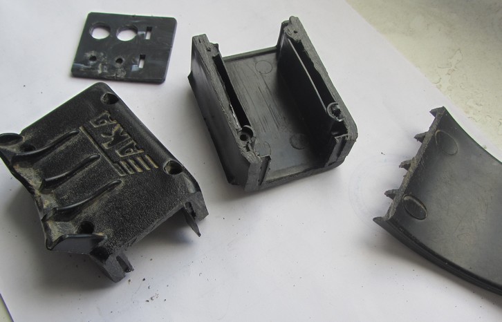 Корпус, кстати, не только свинчен, но и как оказалось - склеен. Так что пришлось распиливать. Хотя углы у этой коробки и скругленные, но основания подлокотника дают возможность выпилить нормальный угол. ![]() Выпилил заготовки - НАкладки и ПРОкладки. Ребро жесткости накладки получилось естественным образом из края оболочки гнезда под винт. В принципе, оно и не особо актуально, ибо основание накладки вышло и так весьма нехуденьким. Поскольку организовать хорошее прижатие накладки при склейке по двум направлениям весьма проблематично, то ширину прокладки сделал примерно на треть мм больше чем надо (пришлось гадать, лучше было бы еще поменьше; само собой - для склейки дихлорэтаном, в расчете на то, что пластик подрастворится и накладка войдет враспор между ребрами катушки) и сточил клином по направлению к вертикальной плоскости (ширину плоскости подогнал под расстояние между ребрами) Прокладки вытачивал наподобие коронки на зуб, из толстой и маленькой части стенки (высоты чуть не хватило в итоге). Подравнивать пеньки на катухе не правильно, они дают поверхность склейки, на которую будет силовая нагрузка - пришлось повозиться с подгоном прокладок |