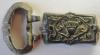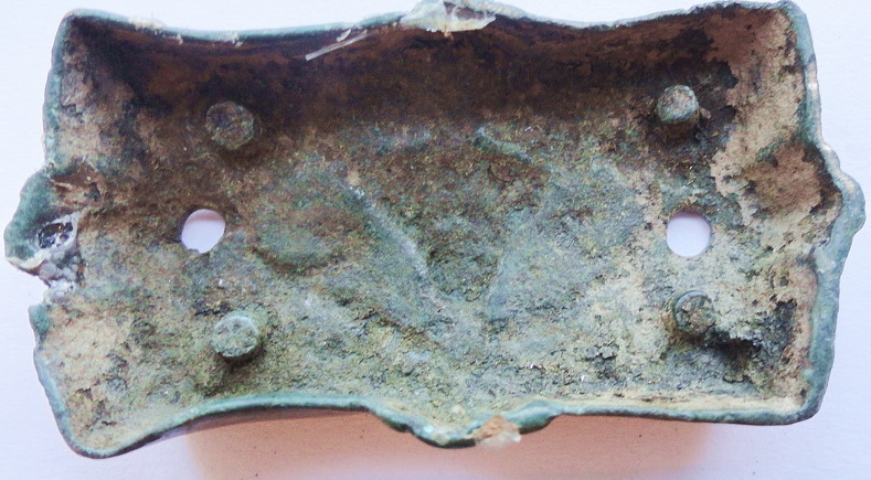 Изначально накладка крепилась к ремню шпыньками. Очевидно уже позже в накладке были проделаны дырки, с помощь которых пришивалась к ремню.