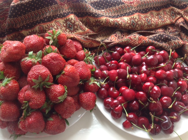 В Узбекистане уже поспел первый урожай клубника и черешня и даже абрикосы,их не сфотографировал,а зря натюрморт был бы еще лучше,так что верьте на слово.