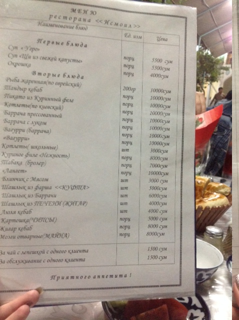 Меню ресторана. Для ясности 1000 сум=12,5 рублей. Кстати "Чор Бакир" тоже посещал (но это я обращаюсь к Rangtosh, т.к. другие пользователи вряд ли понимают о чем я говорю