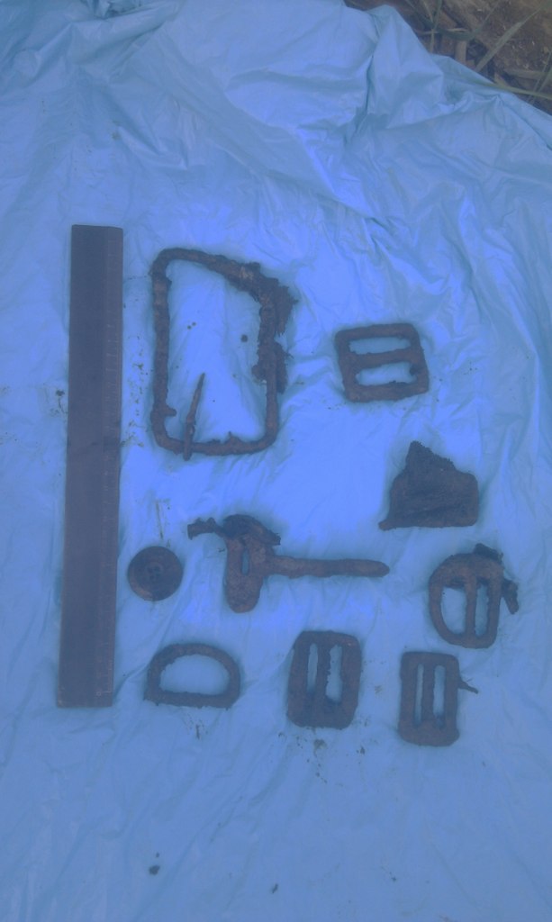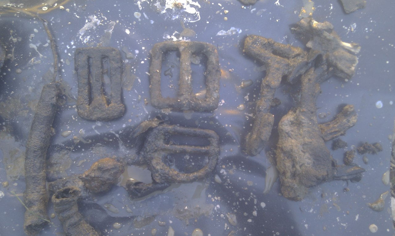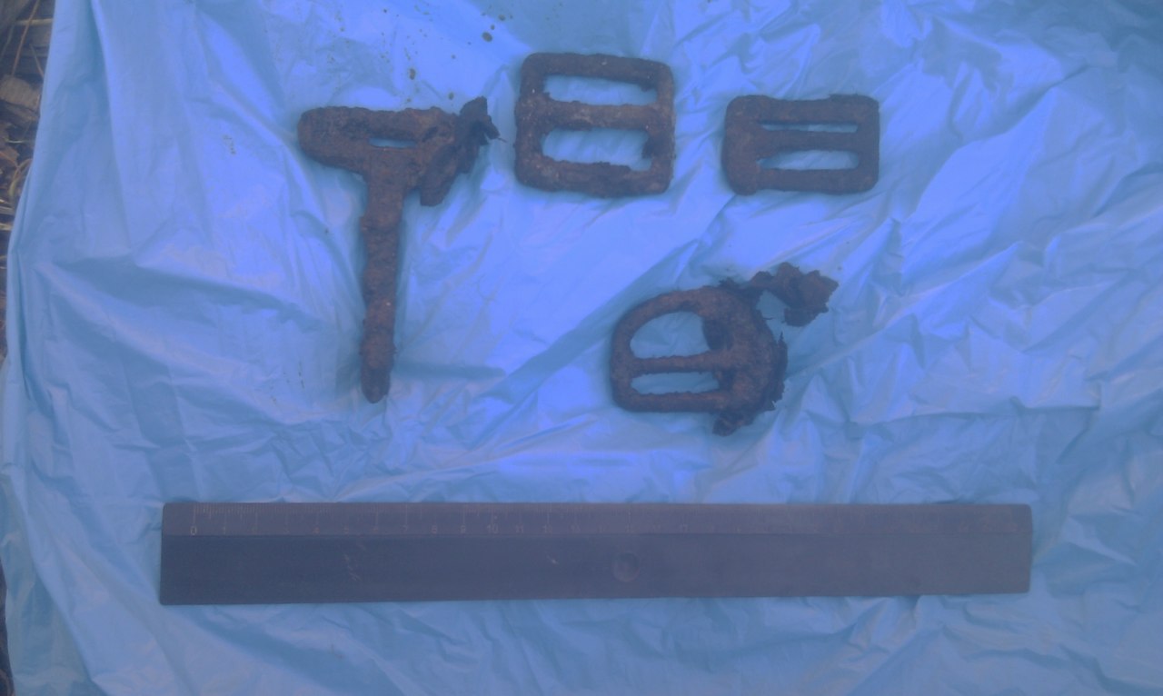 На останки напоролись довольно быстро.Они были прикрыты листом сгнившей фанеры.Но вот только это были останки не немецкого лётчика , а двух советских.Скорее всего их связали тросом и скинули в яму.Хорошо сохранились застёжки парашутных ремней и кольцо. Был найден погон с тремя еле различимыми лычками , кусок химического карандаша и больше ничего..Кто они были ,из какой части.....Наверно это уже не узнает никто,они так и останутся неизвестными... Вложенные эскизы изображений |