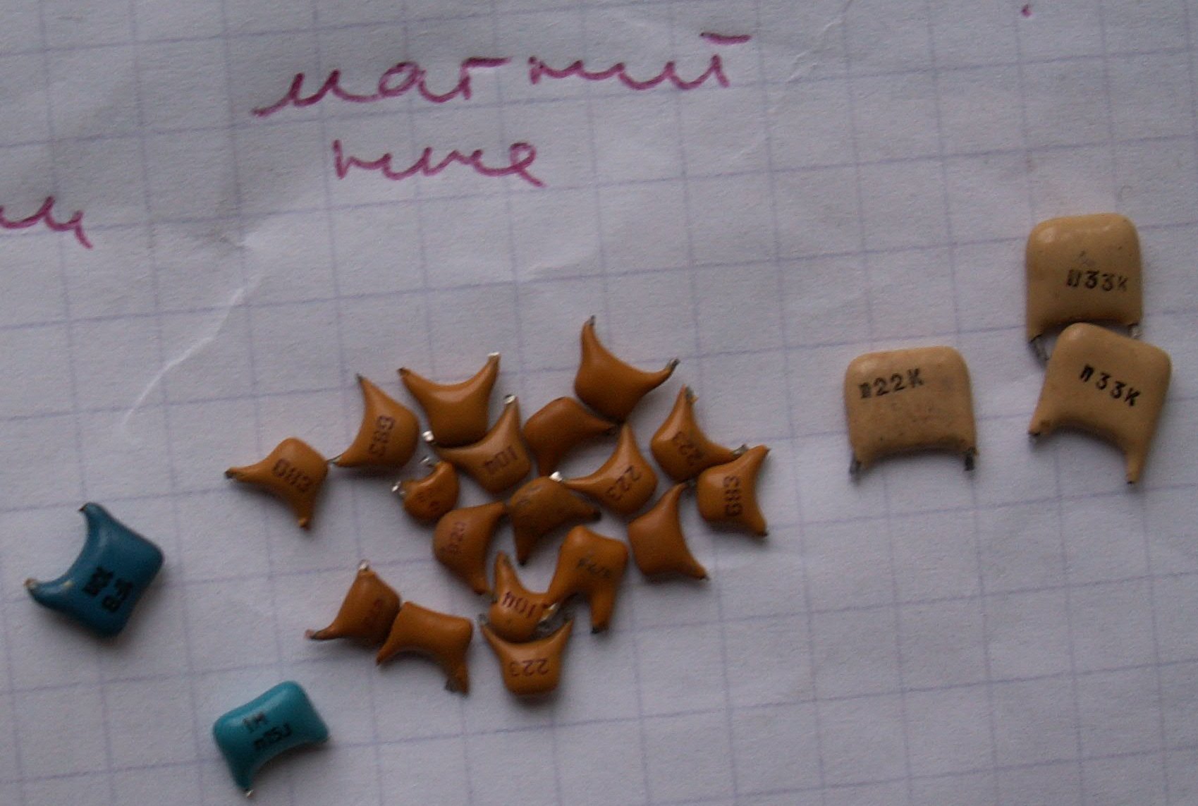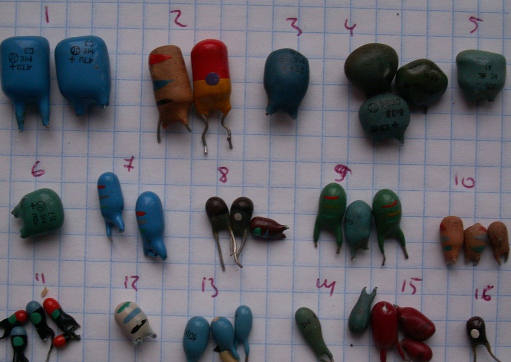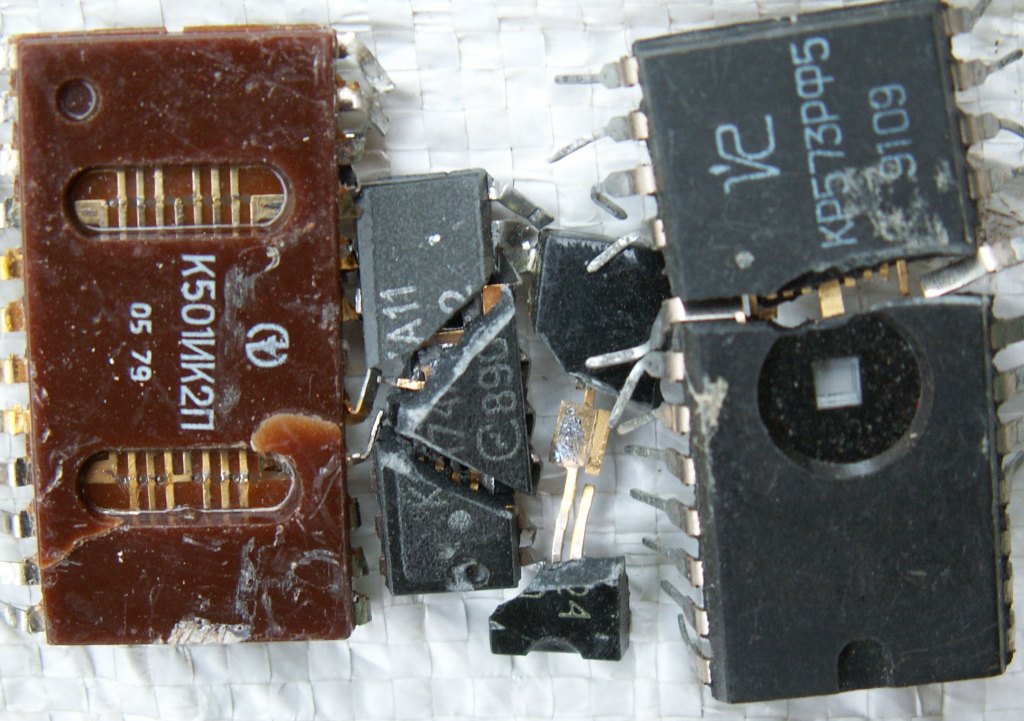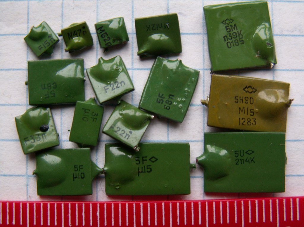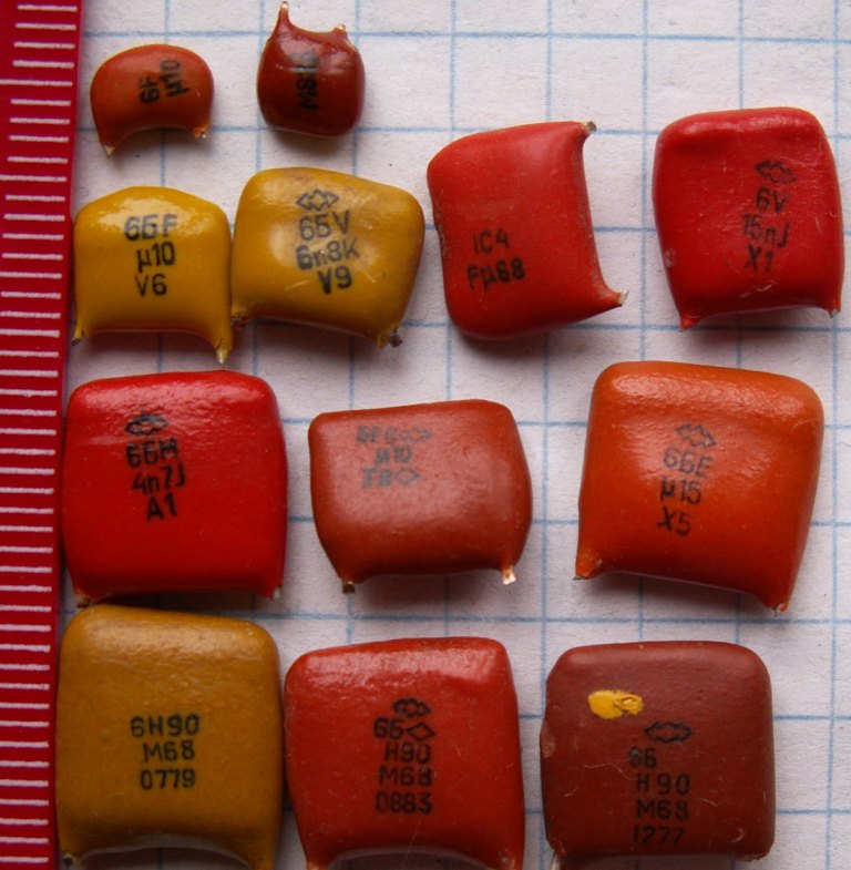 микросхемы если содержат жёлтые следы после раскусывания.то идут на сдачу. в пустышках просто никелевые выводы или волоски золотые невидимые. делят на импортные и советские. а подобные к565ру5 и к565ру6 дороже общей массы наверное вот конденсатор толи танталовый или ниобиевый-не подскажу точно и фото конденсаторов болгария бывают (не магнитные. с магнитными ножками) . какие там у вас жёлтые конденсаторы не знаю