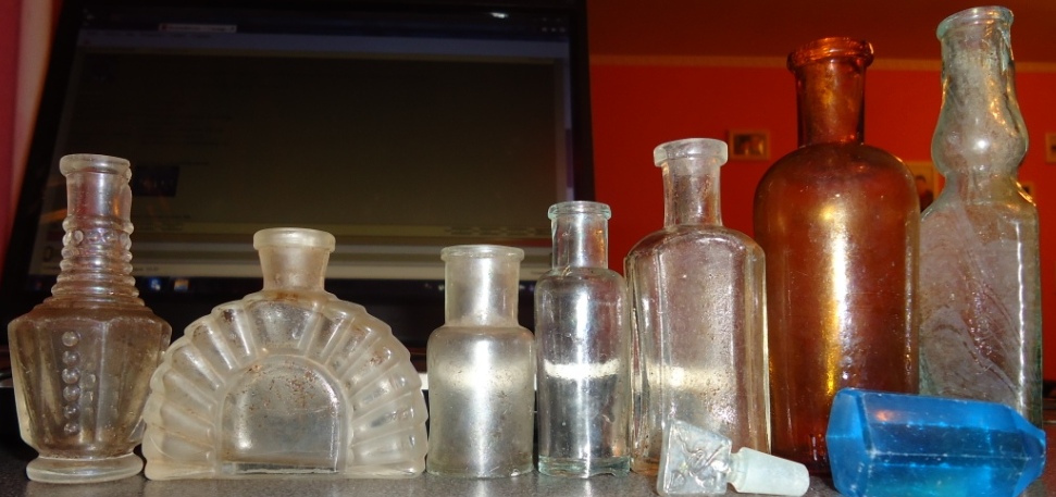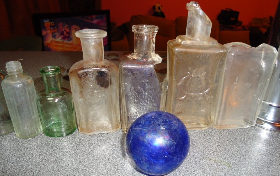 Коллеги, за прошлый сезон нашёл несколько стеклянных бутылочек. Оцените пожалуйста. Что то есть ценное, или все выкинуть можно. И подскажите, что за синий шар на фото???