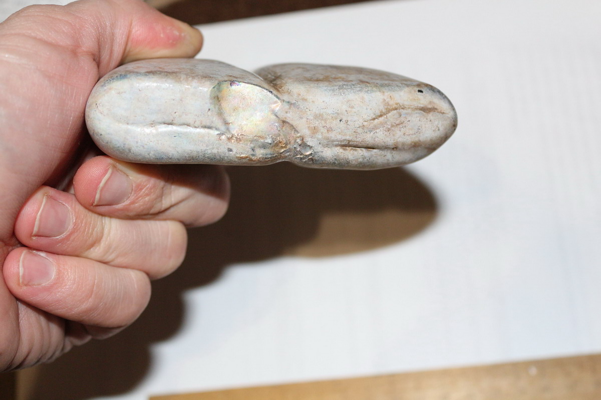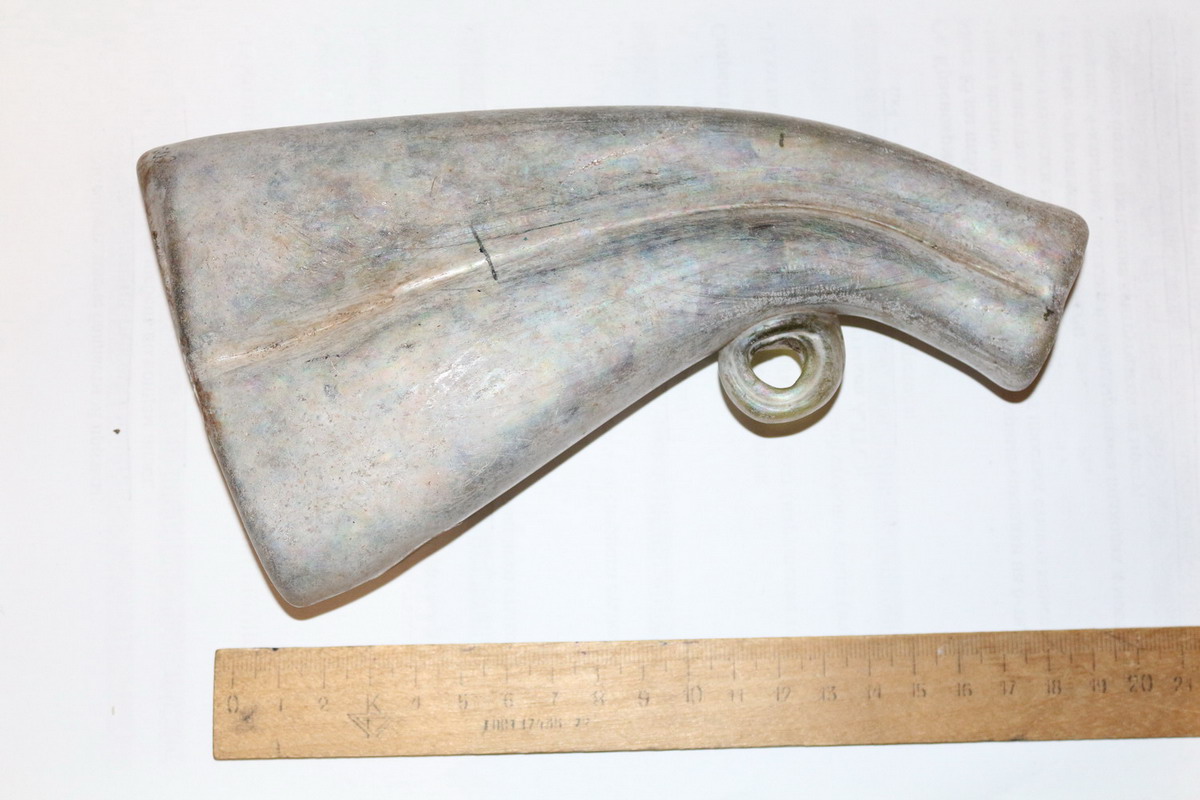 Сегодня было найдено сие творение в форме пистолета! Бутылка из мутноватого бело-желтого стекла, разделена на 2 части перегородкой! Обьем обеих частей примерно одиноковый! Длина 19 см ширина дна 10 см! Вроде бы по виду что то старое но валялась среди советского стекла 30-х 40-х годов.... Прошу определения периода изготовления бутылочки и примерную стоимость! Вложенные эскизы изображений |
