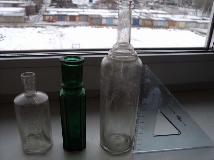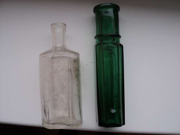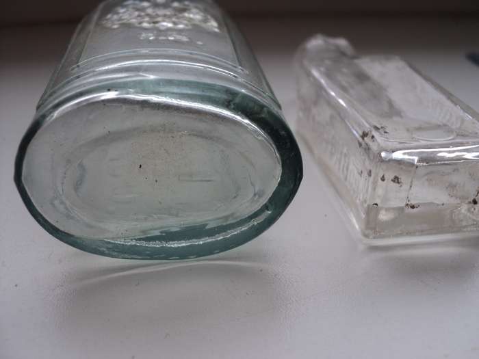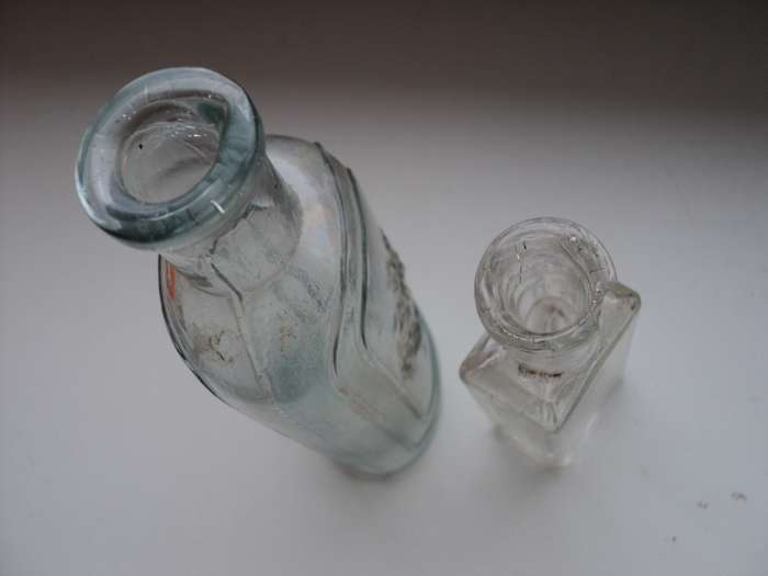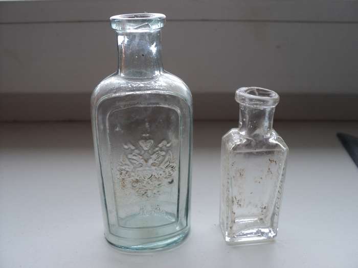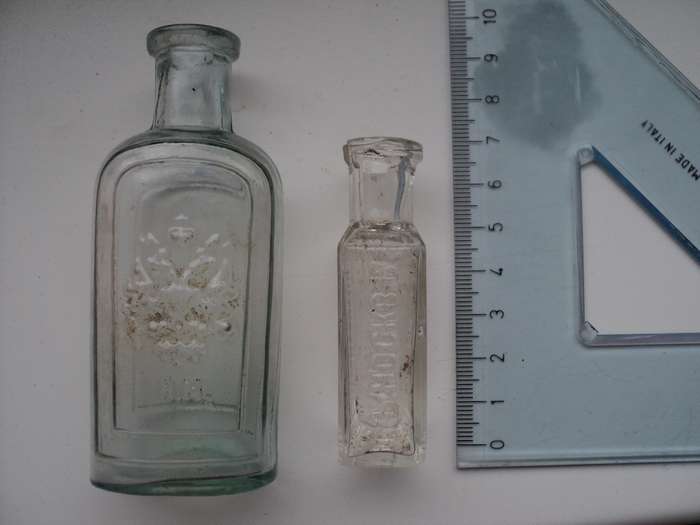 На нижних - аптека: стандартный флакон, относимый многими к производству заводов Нечаева-Мальцова; мелкий - аптека Феррейна в Москве, типа мозолина что-то. Стандартный - 100-200, Феррейн - 200-300, возможно, чуть больше. |