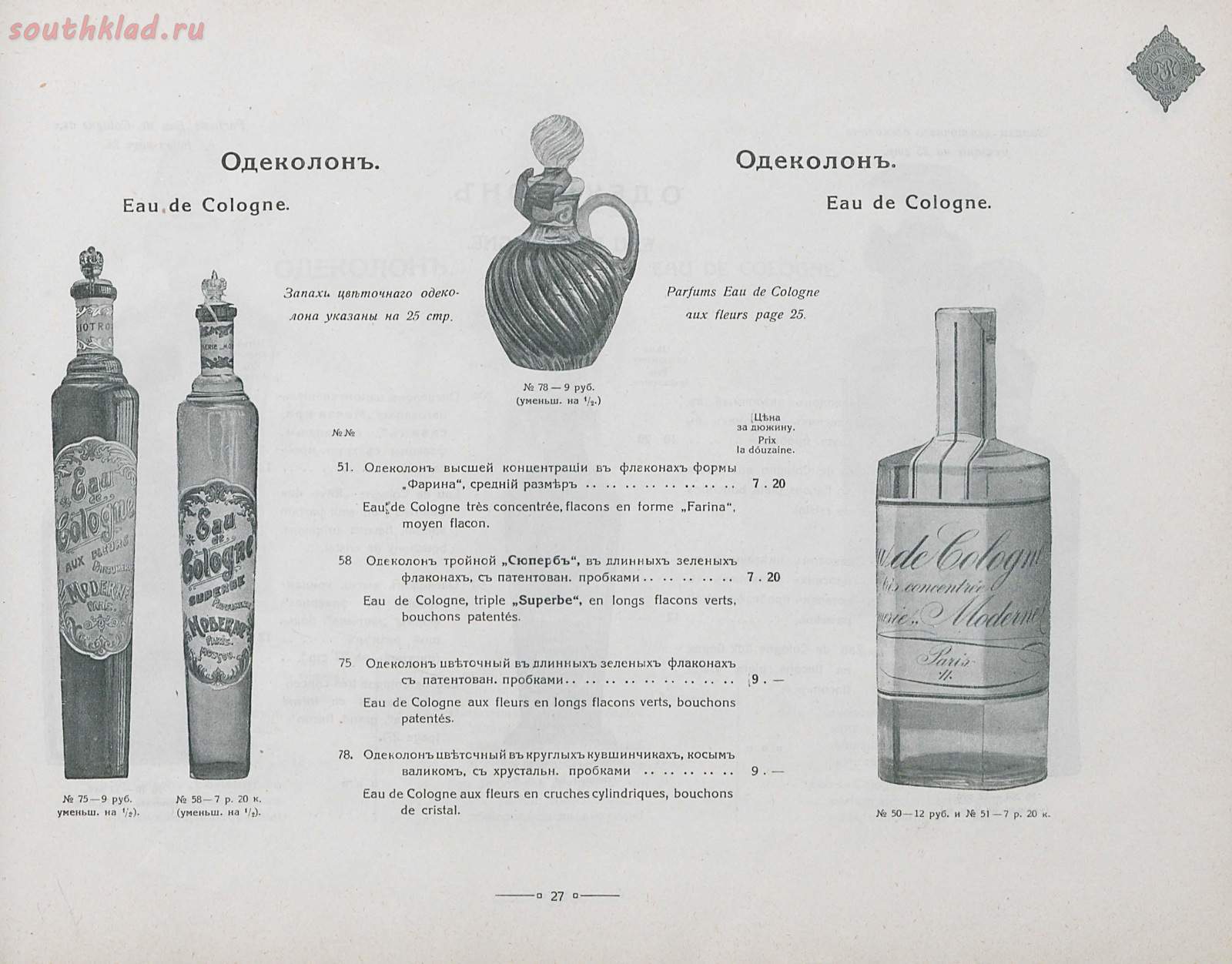 QUOTE(Тымф @ Sep 1 2022, 09:52) Склянка для духов с прессованной пробкой производства заводов И. Ритинг и Ко, № 5690_b в Прейскуранте 1897 года. QUOTE(Stierlitz @ Sep 1 2022, 15:10) Добавлю, что от парфюма "Модерн" №78 в Прейскуранте. Тымф, Stierlitz, спасибо! Было желание йод налить ... что-то остановило. Пробовал найти этот прейскурант, в поиске, различным сочетанием слов, не получилось. Где можно посмотреть прейскурант? Очень интересно. -------------------- Смотри внимательно, выиграешь обязательно...
