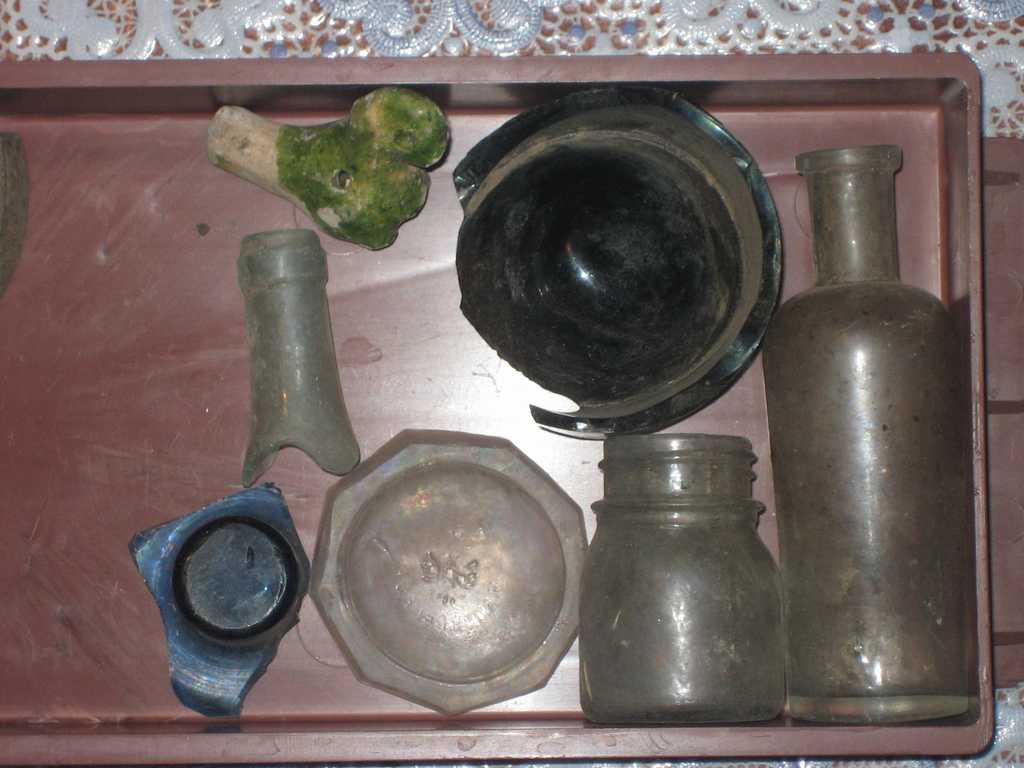 Недавно выкопали пару стекляшек! В основном осколки! На высоком пузырьке надпись - Кн.О , как мне подсказали что это стекольный завод Князя Оболенского....