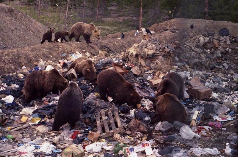 Фотка если честно стрёмная,у медведей своя иерархия,сложная,а здесь они как коты на свалке,а ведь медведица на дальнем плане,с совсем малыми ..проще говоря с кормом для собравшейся братии. Фотошоп наверняка,да и что так можно рьяно ковырять на свалке (?) разве керосин разлили.