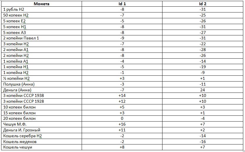 QUOTE(Ohotnik_mur @ Feb 15 2020, 22:00) Спасибо. Надо бы указать в инструкции и на goldenmask-spb, где Вы продаёте эти приборы. Не придётся искать, где-то и как-то, все параметры. Спасибо за замечание! Как ранее обещал, сделал некоторое подобие библиотеки для дискриминации целей по id. Это касается интересных типовых медных и серебряных монетные целей. Если внимательно посмотреть, то можно увидеть, что большинство монет лежит в диапазоне от -9 до -1 по id1 и от -32 до - 9 по id2. Несколько выделяются билоны на положительных значениях id. Ноль шкалы id я специально сместил в настройках Стингера к мелкой медной монете. Однако, при желании, оператор может сам поставить начало отсчёта на требуемое положение. Но мне кажется, что такое положение нуля наиболее удобно. Вложенные эскизы изображений |