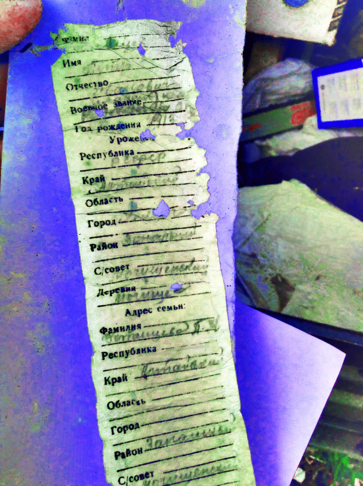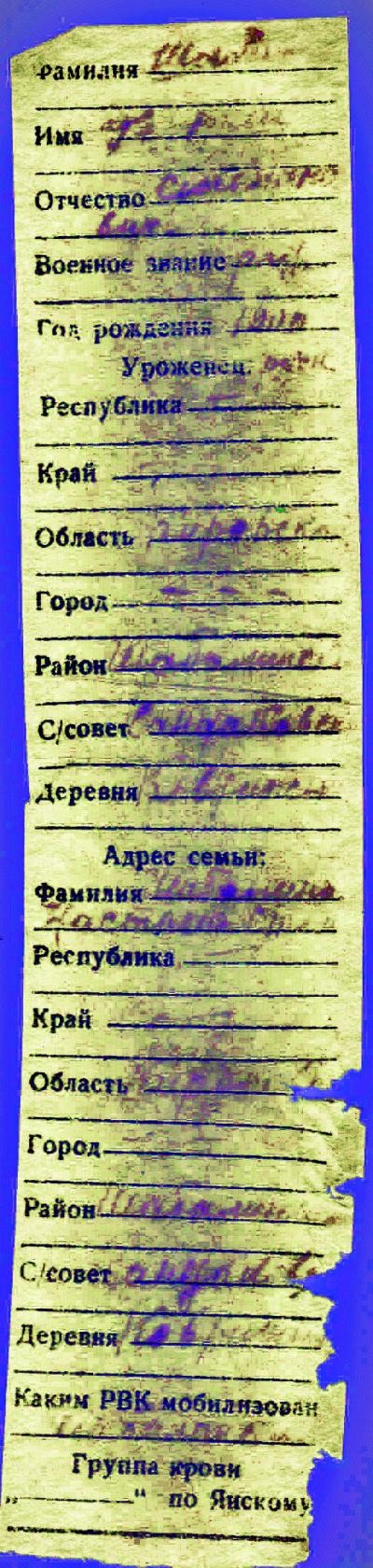 QUOTE(Givanich @ Oct 24 2016, 20:27) Володя! Спасибо! Сижу, размышляю о бренном... QUOTE(oleg_g @ Oct 25 2016, 16:27) Спасибо, Вова! А имена тех двоих - Ботищев Петр Иванович 1913 г.р. с Алтая и Шабалин Георгий Степанович 1900 г.р. из Кировской области Олег, не представляю, как можно что-то там разобрать! Вам с ребятами спасибо за бойцов!!! -------------------- В этой жизни серьёзно нужно относиться только к шуткам.