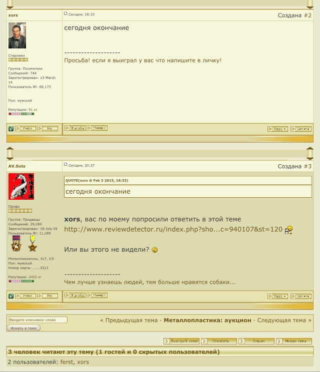 QUOTE(баба Валя @ Feb 1 2015, 12:51) Вот еще интересная тема А мне так же интересно, вот в этой теме продавалось как копия? http://www.reviewdetector.ru/index.php?showtopic=746413&hl= (фото к сожалению удалены) А потом вот тут что продавалось? http://www.reviewdetector.ru/index.php?showtopic=808075&hl= Не один ли и тот же предмет это был... -------------------- Чем лучше узнаешь людей, тем больше нравятся собаки...