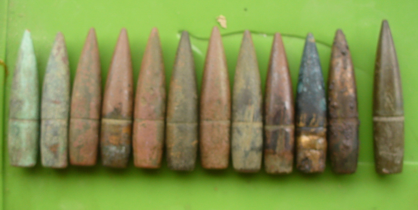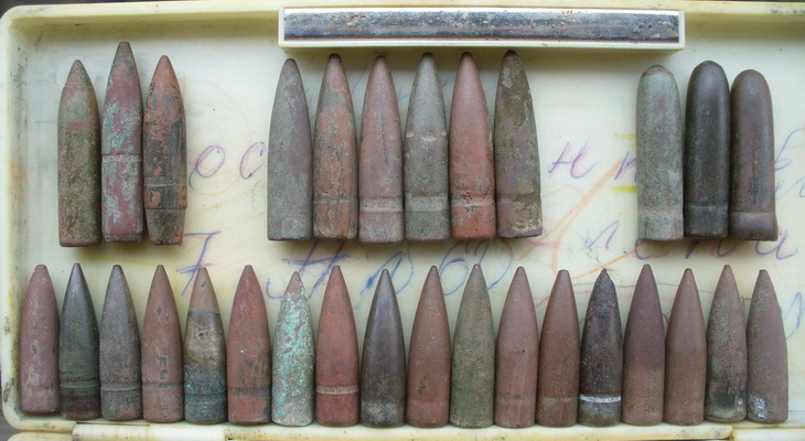 Добрый день. От чего будет.По рассказам в том месте был аэродром.Длинна большой 155 мм калибр похоже 37 мм. Маленькая длинна 115мм,калибр затрудняюсь сказать т.к. замята сильно.Большая похоже от авиационной пушки хотелось бы марку пушки узнать,а маленькая от крупнокалиберного пулемета? тоже марку если можно.