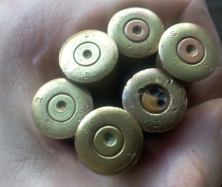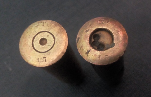QUOTE(Антон П. @ Mar 8 2016, 14:55) Здравствуйте,попались винтовочные патроны калибра 7.62,Тульского завода,с лева 17 года,а с права то ли 15,то ли 16.Вот по левому все ясно,а правый какой то странный,шейка гильзы более длинная,ранее такие не находил.Прошу подсказать по гильзе. левая стрелянна, правая нет. с правой еще что то рукоблудили да они обе странные, у левой донце плоское почему то. |