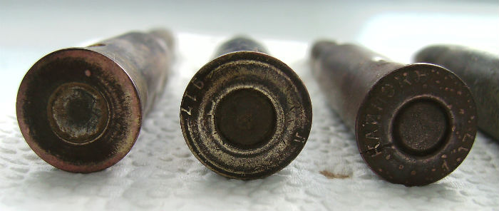 Добрый вечер!Вот попались такие патроны,по первым трем,встречаются часто я так понимаю от винтовки Мосина,четвертый тоже попадались раньше,не знаю от чего?А вот пистолетный попался впервые.Помогите пожалуйста идентифицировать.
