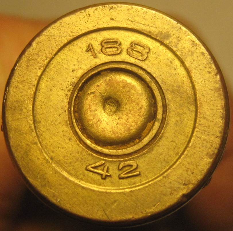QUOTE(O.DYN @ Nov 24 2019, 18:29) Всем добра! Подскажите, будьте добры, что за гильза и из чего стреляная, диаметр 21-22 мм, длина 65мм … Если состояние позволит конечно. Год 18?? вроде просматривается. Спасибо. Гильза 20х99R для 20мм авиапушки ШВАК. На 12 часов указан номер завода. 187-й завод(ТПЗ) - один из массовых изготовителей этих гильз, но судя по расположению цифр и остаткам выпуклого канта, мне думается, что это 188-й завод. На 6 часов что-то похожее на "42" - это год. Клеймо было выпуклым, но, видимо, поле донной части было загрязнено(смазкой, например) и потому цифры съелись, причем коррозия пошла глубже поля. В-общем, ценности не имеет никакой. Клеймо, видимо, было таким. Вложенные эскизы изображений |