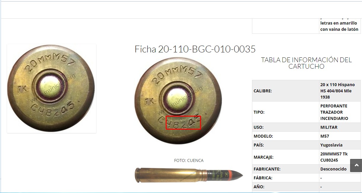 Дословный перевод такой: КАЛИБР: 20 x 110 Hispano HS 404/804 Mle 1938 ТИП: ПИРСИНГ ТРАСЕР ИСПОЛЬЗОВАНИЕ: ВОЕННЫЕ МОДЕЛЬ: М57 СТРАНА: Югославия МАРКИРОВКА: 20МММ57 ТК CU80245 ПРОИЗВОДИТЕЛЬ: Неизвестно ФАБРИКА: - ГОД: - НАБЛЮДЕНИЯ: Патрон API-T с черным стальным снарядом, красной полосой и желтыми буквами в латунной оболочке. По производителю,тоже непонятно. Сообщение отредактировано некс: Jan 29 2022, 10:35 Вложенные эскизы изображений |