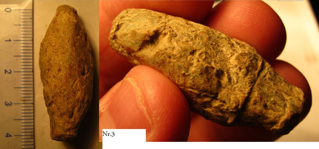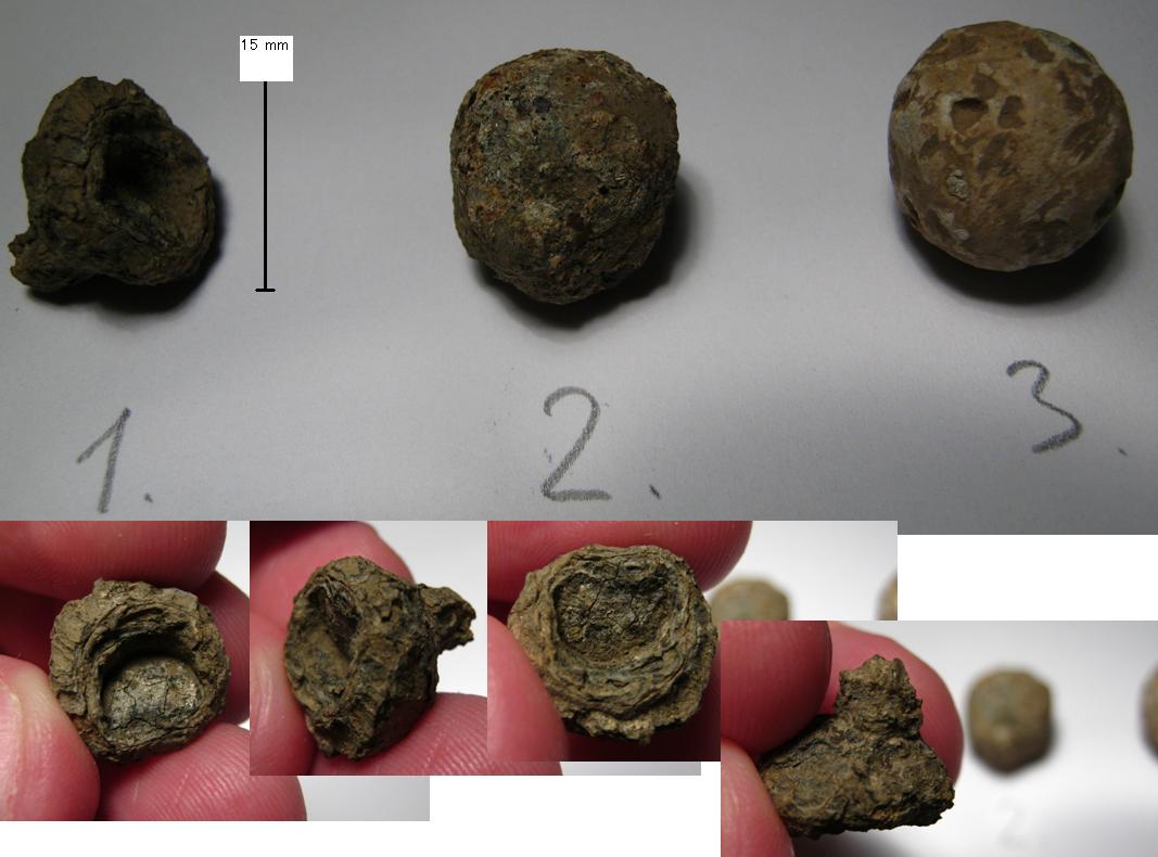 Снова вопрос: попалась такая "пулька" - номер 1 на фото; материал свинец (по-крайней мере - сигнал был "цветной"; нож оставляет блестящую вмятину. Однако поверхность покрыта "коркой"; корка крошится). В отличие от других моих "свинцовых шариков" у этой - ножка (литник?), сохран никакой (настолько "старинная"? Образуется ли на свинце "корка"). А главное, на предмете имеется некое вдавление на противоположной "литнику" стороне - не след ли от шомпола? Неужели старинная мушкетная пуля со следами "забивания в ствол" Вложенные эскизы изображений |