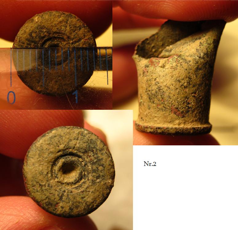 Корка на свинце образуется, но в виде белого налета переходящего в мелообразное вещество. Т.н. оловянная чума. В Вашем случае я бы предположил что №1 это остатки пуговицы, возможно цинковой или типа того. Дырки в головной части встречаются на нестрелянном свинце в основном при извлечении осечного выстрела специальной выкруткой. След как от большого шурупа... |