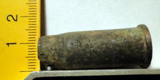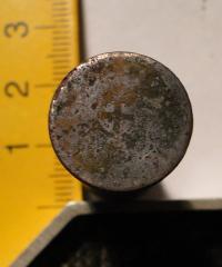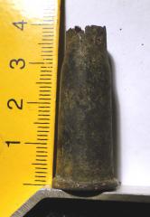 Ув. коллеги еще попалось -неск. нечасто встреч.(у нас по крайней мере) экз. Мося ст. образца-пуля была забита обратной стороной,мося с Ремингтоновской гильзой и еще не встречавшийся ранее патрон.Сужения горлышка -нет,хотя может и обрезан. В справочнике Жука не нашел,донце плохо просматривается-сделал рисунок. Т.к. попался впервые -интересует от чего.Зараннее спасибо!