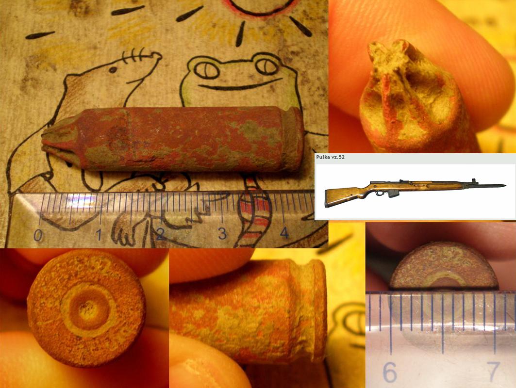 QUOTE(immunophi @ Jun 4 2012, 22:38) Всем привет! Такая вот "штучка" попалась на окрае одного чудного поля. Подумал - ага, холостой патрон однако. Но капсюль - битый?! Кажется, мне попался патрон, давший осечку? Стоит ли держать дома? На полочке смотрится весьма. А не "бубухнет"? Гильза с маркировкой bxn 1 52 - чехословацкий 7,62x45 vz.52, "Сельер Беллот", 52 год. Всем - удачных и безопасных находок! Холостой патрон с осечкой;бухнет только если в костёр,а так целиком и полностью безопасен;В принцепе прицепиться к осечке не должны,но на всякий случай лучше просверлить и ссыпать порох. QUOTE(Retailer @ Jun 5 2012, 09:53) Спасибо за исчерпывающий ответ, а не напишете ссылочку на эти данные? Пожалуйста,только тут вроде ссылки на сторонние ресурсы не приветствуются...Взял тут |