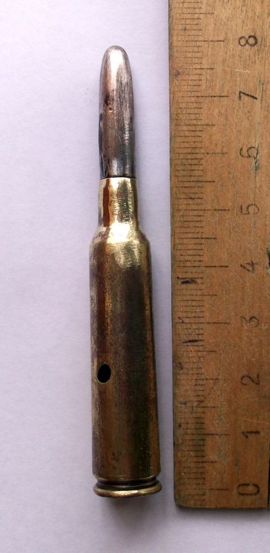 Попалась трехлинейная гильза, заткнутая пулей, но пуля перевернута вверх ногами?? Выковырнув, нашел внутри кусок отрубленного прутка, трапе- циевидного сечения длиной около 3,5 см. Где-то вроде, читал, что это служило как вроде персо- нального жетона или капсулы. Прошу разъяснить, кто ведает, что это. П.С. На самой широкой плоскости, вроде, что-то просматривается, но коррозия сделала свое дело. -------------------- Искать Всегда,