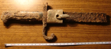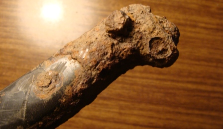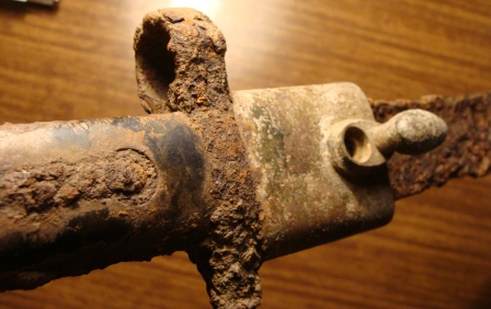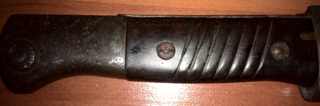 Доброго дня,уважаемые форумчане помогите определить и по возможности оценить этот штык-ножичек фото вышли темноватые сам крепок, но каверны имеются ,длинна клина 38 см. общая 51 ,остатки накладок деревянных рассыпались в руках,клеймо просматривается треугольник с буквами внутри,номеров не нашёл,заранее благодарен за ответы с уважением Дмитрий