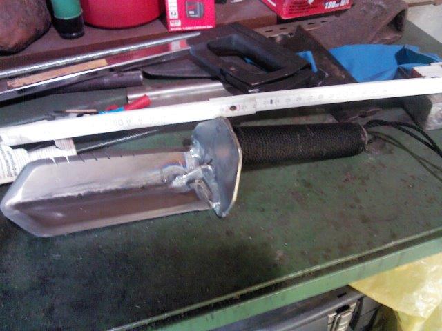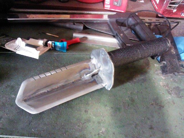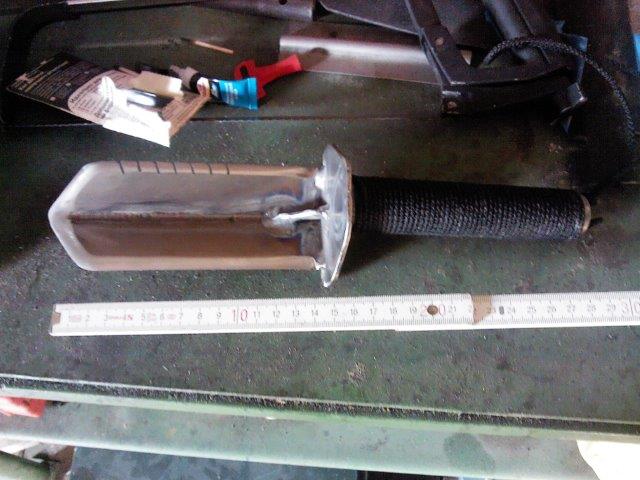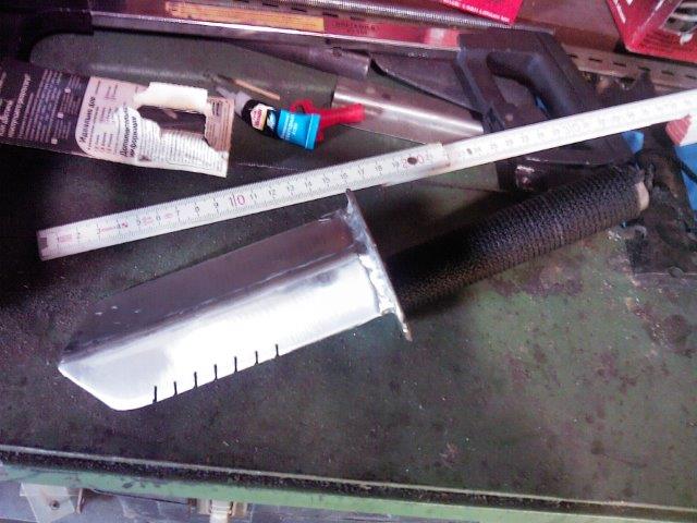 тоже себе девайс смастырил, ручка от э/дрели лезвие - мастерок длинный советский еще, сталь там ух! Сделал складным по принципу лопаты, и лезвие сперва с китайской складной саперки взял, но оказалось сыромятина даже закалке не поддается