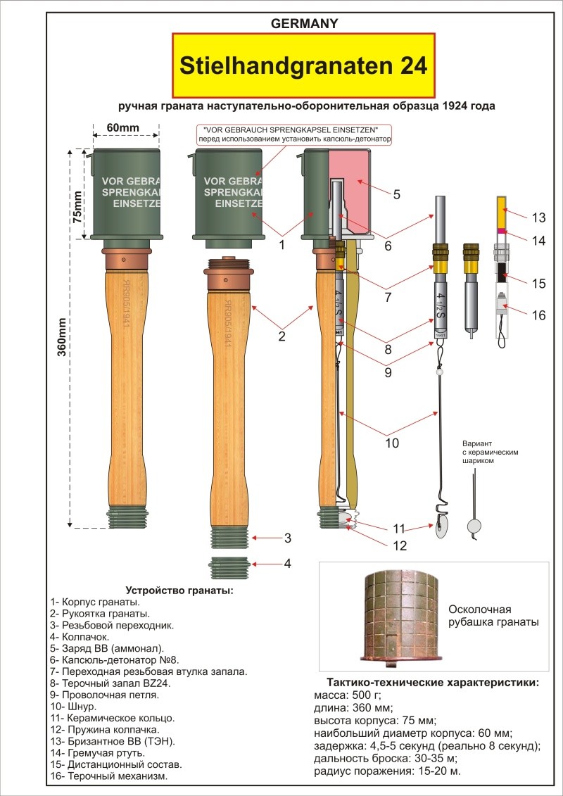 Итак про М24,в простонародии "колотушка","толкушка" я уже писал.. Опасны снаряженные пикриновой кислотой.. Цифра 5 на банке.. Не будем их рассматривать.. Возьмем обычные гранаты вышеупомянутые в теме,снаряженные одним и тем же ВВ.. Но не пикриновой кислотой,тогда две сравниваемые гранаты будут одинаково опасны.. Итак М 24.. Основное вещество снаряжения аммонал.. Боиться сырости... Граната состоит из банки и деревянной рукоятки, в которую ввинчивается запал терочного типа,сама рукоятка полая и в ней спрятан капроновый шнурок с фарфоровым шариком(реже кольцом).. (Такой же терочный принцип к примеру использован в сигнальных ракетах..) Итак отвинтив крышку внизу рукоятки(прямо как на ракете) вытаскиваем шнур,с силой дергаем его и бросаем... Этот терочный запал очень не надежен.. Были случаи гранаты рвались в руках, часто давали задержку вместо положенных 4-5 сек до 8-10.. Если граната не взорвалась.. то практически она уже не взорвется.. М34 ВВ-пресованный тротил,наиболее устойчив к изменению условий хранения.. Другое дело в М34, как я посмотрел по предложению уважаемого Новгородца,эта граната ударного типа, то есть взрывается от удара о препятствие.. Хватает малейшего удара,стряски.. И если в М24 запал мог либо не прогореть,либо прогореть и не сработать, то в данном случае граната чрезвычайно опасна. Она довольно герметична и если на ней нет предохранительной ленты одному Богу известно, что может случиться об ударе по ней лопатой при копе.. Сообщение отредактировано beeluga: Jun 17 2008, 07:54 Вложенные эскизы изображений -------------------- ЕСЛИ БЫ "ЧЕРНЫХ КОПАТЕЛЕЙ" НЕ БЫЛО, ИХ СЛЕДОВАЛО БЫ ВЫДУМАТЬ"