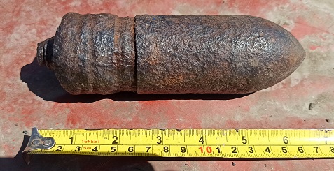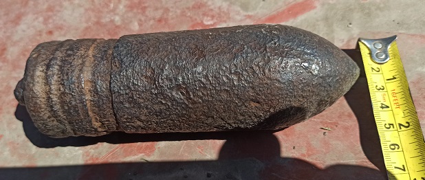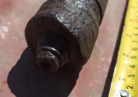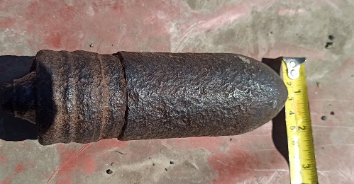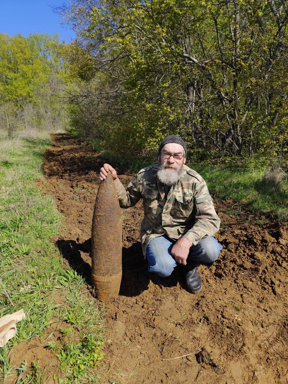 За последние лет 6 уже 5 попался и все в одном месте (примерно 1 га) все в черте поселка,50-300м. от домов. Этот был промеж колеи на дороге, которой пользовались еще при царе, торчал почти вертикально донником вверх на глубине всего 15см. Самое интересное, что в 50 метрах стоит дом в котором я прожил последние 12 лет. Высота 90см. охват 67см.