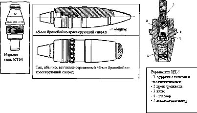 Снаряды — осколочно-фугасные и бронебойно-зажигательно-трассирующие. Осколочно-фугасный снаряд представляет собой стальной цилиндр с ввинченным в головной части взрывателем. Медный ведущий поясок находится примерно посередине снаряда. Снаряжен литым тротилом. Взрыватели типа КТМ (коллектив трубочников, мембранный) — головные ударные взрыватели с двумя установками на мгновенное и инерционное действие, полупредохранительного типа. При выпуске с завода взрыватель установлен на инерционное действие (с навинченным установочным колпачком), для установки взрывателя на мгновенное действие установочный колпачок перед выстрелом свинчивался. Стрелянный снаряд (со следами нарезов на ведущем пояске) может представлять опасность при перемещениях снаряда с места находки. Бронебойно-зажигателыю-трассирующий снаряд представляет собой тяжелый снаряд пулевидной формы, небольшого размера. На головной части имеется баллистический колпак, который обычно сгнивает и снаряд находят обычно с как бы "обрубленной" головной частью. Ведущий поясок находится в задней части снаряда. Снаряжен взрывчатым веществом повышенной мощности. В дно снаряда ввинчен взрыватель с привинченным сзади трассером в коническом алюминиевом корпусе. Использовались взрыватели МД-5 — донные взрыватели инерционного действия с замедлением, непредохранительного типа. Взрыватель прост по устройству и имеет высокую чувствительность к ударному действию. Ввинчивается в донную часть снаряда, уплотняется свинцовой прокладкой и не высыхающей мастикой на основе железного сурика. Имеет неподвижный боек (иглу) и подвижный ударник с капсюлем-воспламенителем, который удерживается до выстрела предохранителем из разрезной латунной трубки. При выстреле предохранитель опускается, ударник освобождается и капсюль-воспламенитель становится доступным для бойка, при этом ударник ничем не удерживается и просто болтается внутри, поэтому взведенный взрыватель особо опасен и взрывается даже при встряхивании. Взрыватель изготовлен достаточно качественно, внутренние части из цветных металлов, никелированы и за полвека пребывания в земле не покрываются коррозией. Перед началом войны и в ее начальный период было изготовлено огромное количество снарядов оснащенных МД-5. во время войны из-за опасности обращения этот взрыватель сняли с производства, но не сняли с вооружения. 45-мм бронебойно-зажигательно-трассирующие снаряды представляют наибольшую опасность особенно если на ведущем пояске имеются следы нарезов. Взрыватель неразорвавшегося стрелянного снаряда исключительно чувствителен к любым перемещениям и может взорваться даже при наклоне боеприпаса. Снаряды имеют толстые стенки и изготовлены из легированной закаленной стали, поэтому взрываются с большой силой и осколками. При обнаружении стрелянного снаряда не стоит даже доставать его из раскопа, следует отмстить место его нахождения хорошо заметным знаком. Вложенные эскизы изображений -------------------- Так и бродим на удачу е-хо-хо
