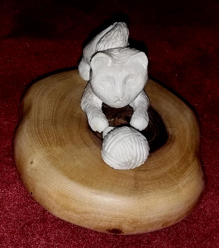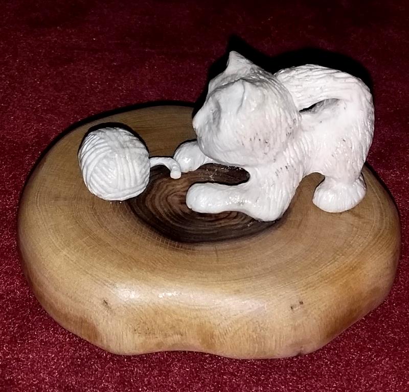 Нэ́цкэ котёнок(Выс -2.7см.Шир 2.5см Длина - 4 см) и клубок(Выс -1 см Шир -1 см.), подставка сделана из фисташки( Шир - 6.5см на 7см Высота - 4.5см.) Вложенные эскизы изображений -------------------- Не судите строго Я только учусь .
