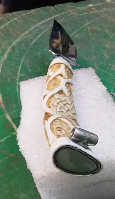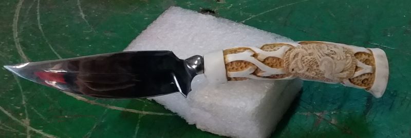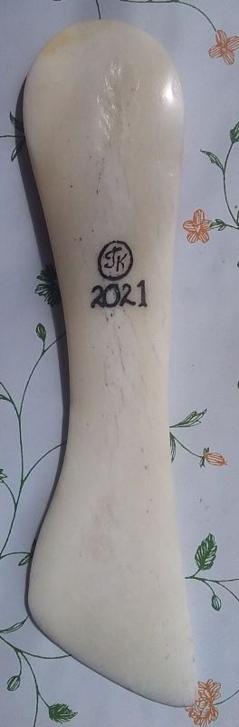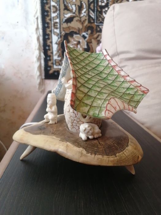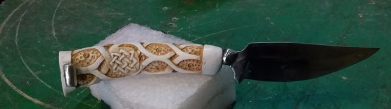 Естественно, определённые так сказать секреты есть, но при этом нет универсальных рецептов, а потому - всё равно постоянные эксперименты и накопление опыта. К примеру - по рогу оленя - я уже говорил, что это - лишь сродни лосю или мелкокопытным типа косули. Но все эти животные сбрасывают рога, а, соответственно, рог даже при своём видимом и внутренем различии имеет в ходе своего роста, ношения и старения разную степень зрелости. Вот этого фактора никто из резчиков не озвучивает, а остальным остаётся лишь наблюдать очевидную разницу в материале и качестве тонировки. Так вот: в пору своей максимальной крепости и "заполненности", рог имеет и наибольшую прочность и наименьшее выщелачивание и при этом, соответственно, хорошо режется и шлифуется - полируется, но красящие составы внемлет в себя наиболее плохо. И наоборот - чем старее рог - тем в его поры лучше проникает краситель. И у лося тоже, ну а где там наиболее плотно и "монолитно"- все мы знаем. По этому белый не старый рог лучше в большей или меньшей мере отбеливать, а не молодой - пускать под тонировку. Вот такой секрет По отбелке - у меня не получилось с гидроперитом, хотя, возможно, я мало держал. В то же время держать олений рог долго в жидкости я не могу - на объёмных изделиях даже малое количество "губки" может набрать влагу, а при усушке - разорвать изделие трещиной. ... В общем, просто беру "Ваниш" "Кристальная белизна" и получаю оную. это ещё один секрет от меня. Вообще рог оленя на срезе может быть из двух- трёх "концентрических" цветов, второй, как правило, темнее - и это тоже используется и позволяет вообще избежать тонировки всяких прогибов и "щёлочек". Изделия из рога я финиширую и это почти всегда ухудшает вид изделия: масло темнит, размазывает рельеф, а на лосе может сделать изделие "мыльным" с виду. Но это же не нефрит, тут такого не надо, хотя без покрытия вовсе - это будет не украшение, а сборник грязи. То есть по количеству тоже всегда и эксперимент и компромисс. С бивнем работаю мало, вырезал несколько украшений с северными человечками, размером с ноготь и меньше. Как держать в руках? - делаем плоский низ и клеим заготовку на суперклей головку большого самореза - теперь имеем прекрасную ручку. И режем и шлифуем и полируем. Тонкости - заточенной иглой... А как сделал - поддел шилом по нарезке в головке - человечек и отскочил. Бивень не покрываю ни чем. Вообще, интересно бы поработать в технике Мандзю, но я не силён в японском эпосе, а тупо копировать или делать что-то не понимая глубинной сути я не хочу. Пока хватает изучения северных этносов. В плане планов - всё решает материал, который уже в тундре скупают презренные китаёзы. Вообще есть заготовки на скульптурки - это, как раз, из материала, малопригодного для резьбы. Станки и приспособы - самодельные... Мой ученик и товарисЧ поменял уже кучу всего - и китаёзные дремели и Форедом (Ихний же), в общем, на месте не стоит. Сравнивал его "Стронг" по тяге на низах с моими самоделками...не, не лучше..мне же проще свинтить моторчики с кассовых аппаратов, или с множительной техники, или по дешовке заказать авиационный, воткнуть на вал цангу, или состыковать с хвостовиком от дешёвого рукава. Конечно, если руки растут не откуда надо - это сложно и для них есть магазины с китайщиной. Нужны ли клепики и маленькие многочисленные резачки? - Да, но мне хватает одного из пол