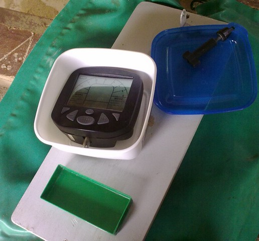 подушка состоит из двух надувных баллонов .транец делается из куска фанеры.по центру транца приделывается ремешок.надуваешь один баллон ,одеваешь ремешок с транцем,надуваешь второй баллон.теперь транец не соскочит.крепление блока-простое ушко.привинчивается простым винтом.самое главное!на ремешок снизу вешаю груз-якорь киль этак пять,чтобы на волне не перевернуло конструкцию.защиту на блок сваял из резиновой диэлектрической перчатки:просто натягивается сверху.вклеил напротив экрана оргстекло,заклеил верх,нарисовал маркером где кнопки.в месте присоединения штекера приклеил палец от той же рукавицы-штекер проходит как бы через трубку.после копа отвинчиваю блок и укладываю его в бокс.это пластиковая посуда для микроволновки.